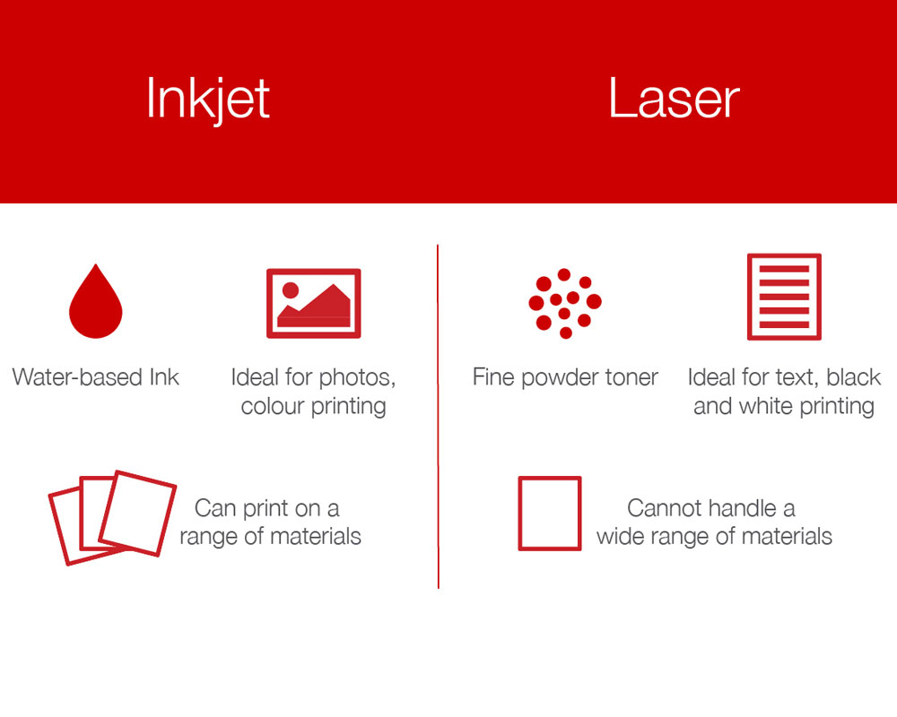 Laser printers and inkjet printers are very different devices that use different technology and fulfil different printing needs. Before we decide between laser or inkjet, let us look at the different types of printers available: