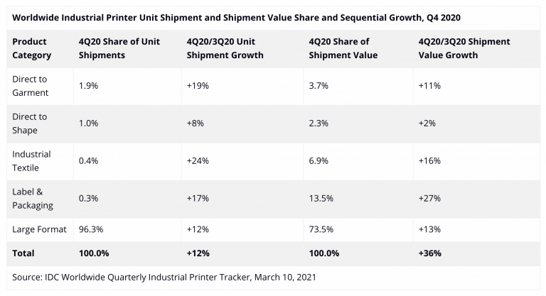 This latest data reveals large-format printer shipments increased 12% over 3Q20 shipments worldwide. For the full year, large-format printer shipments declined by more than 20% year-over-year. New direct-to-shape printer shipments grew 8% in 4Q20 compared to the prior quarter but declined by more than 25% for the year. Shipments in the direct-to-garment segment increased 24% in 4Q20 compared to 3Q20 but declined by more than 20% year-over-year in 2020.